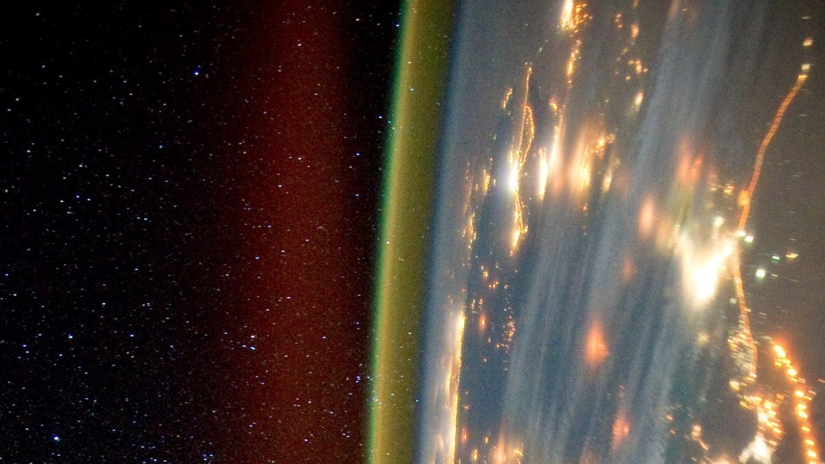 Airglow occurs when atoms and molecules in the upper atmosphere are ionized, either by light from the Sun, or by cosmic rays. There are also chemical reactions that produce light in the atmosphere. All of these effects combine to give the atmosphere a faint but uniform glow day and night. It’s only at night that the effect becomes visible. While the green glow of molecular oxygen tends to be the dominant color, you can also get yellow from sodium, red from atomic oxygen and even a weak blue glow.