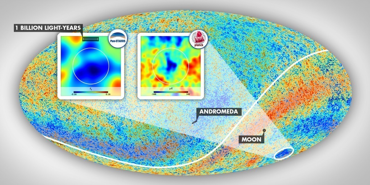 Paper: István Szapudi, et al. Detection of a supervoid aligned with the cold spot of the cosmic microwave background. MNRAS 450 (1): 288-294 (2015)